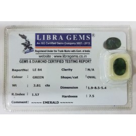 REPORT NO . LE 84CLARITY . N/ACOLOUR . GREENSHAPE / CUT . OVALWT . 3.81 CTSDIMENSION . 1-9.8-5.5-4.R . INDEX . 1.57HARDNESS . 7.5COMMENT . EMERALD..