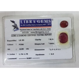 REPORT NO . LR 89CLARITY . N/ACOLOUR . PINKSHAPE / CUT . OVALWT . 8.00 CTSDIMENSION . 2-7.1-3.5-1.R . INDEX . 1.76-1.78HARDNESS . 9.0COMMENT . RUBY..