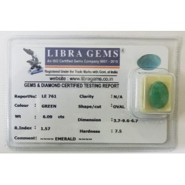 REPORT.NO.LE 761CLARITY.N/ACOLOUR.GREENSHAPE/CUT.OVALWT.6.09 CTSDIMENSION.3.7-9.6-6.7R.INDEX.1.57HARDNESS.7.5COMMENT.EMERALD ..