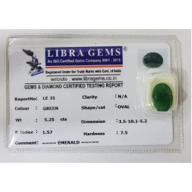 REPORT NO . LE 31CLARITY . N/ACOLOUR . GREENSHAPE / CUT . OVALWT . 5.25 CTSDIMENSION . 3-5.10-1.5-2.R . INDEX . 1.57HARDNESS . 7.5COMMENT . EMERALD ..
