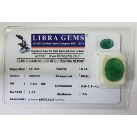 REPORT.NO.-LE 321CLARITY.-N/ACOLOUR.-GREENSHAPE/CUT.-OVALWT.-7.53 CTSDIMENSION.-5.9-3.1-4.6R.INDEX.-1.57HARDNESS.-7.5COMMENT.-EMERALD..