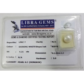 REPORT.NO.-LPKC 7CLARITY.-N/ACOLOUR.-SHINING WHITESHAPE/CUT.-ROUNDWT.-4.21 CTSDIMENSION.-9-1.8-4.7-7.R.INDEX.-N/AHARDNESS.-3.0COMMENT.-PEARL K.C { HONGKOK }..