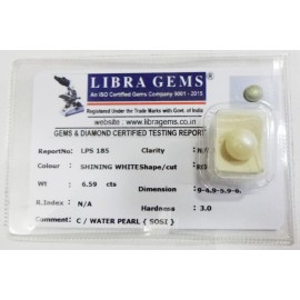 REPORT NO . LPS 185CLARITY . N/ACOLOUR . SHINING WHITESHAPE / CUT . ROUNDWT . 6.59 CTSDIMENSION . 9-4.9-5.9-6.R . INDEX . N/AHARDNESS . 3.0COMMENT . C / WATER PEARL { SOSI }..