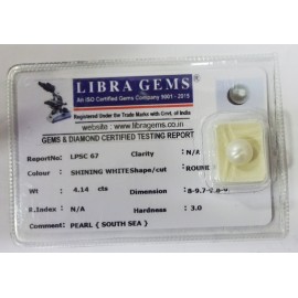 REPORT NO . LPSC 67CLARITY . N/ACOLOUR . SHINING WHITESHAPE / CUT . ROUNDWT . 4.14 CTSDIMENSION . 8-9.7-9.8-9.R . INDEX . N/AHARDNESS . 3.0COMMENT . PEARL { SOUTH SEA }..