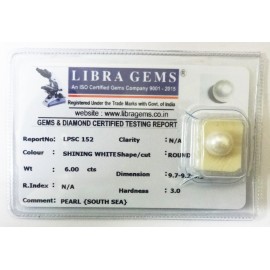 REPORT.NO.LPSC 152CLARITY.N/ACOLOUR.SHINING WHITESHAPE/CUT.ROUNDWT.6.00 CTSDIMENSION.9.7-9.2-9.2R.INDEX.N/AHARDNESS.3.0COMMENT.PEARL{SOUTH SEA}..