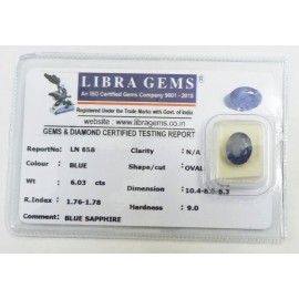 REPORT.NO.LN 658CLARITY.N/ACOLOUR.BLUESHAPE/CUT.OVAL WT.6.03 CTSDIMENSION.10.4-8.5-6.3R.INDEX.1.76-1.7.8HARDNESS.9.0COMMENT.BLUE SAPPHIRE..