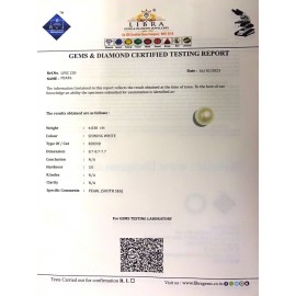 REPORT.NO.LPSC 102CLARITY.N/ACOLOUR.SHINING WHITESHAPE/CUT.ROUND WT.6.53 CTSDIMENSION.9.5-9.9-9.4R.INDEX.N/AHARDNESS.3.0COMMENT.PEARL {SOUTH SEA}..