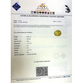 REPORT NO . LY 54CLARITY . N/ACOLOUR . YELLOWSHAPE / CUT . OVALWT . 8.05 CTSDIMENSION . 3-2.9-5.6-2.R . INDEX . 1.76-1.78HARDNESS . 9.0COMMENT . YELLOW SAPPHIRE..