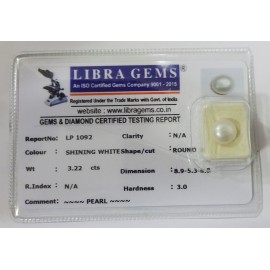 REPORT NO . LP 1092CLARITY . N/ACOLOUR . SHINING WHITESHAPE / CUT . ROUNDWT . 3.22 CTSDIMENSION . 8-9.5-3.8-9.R . INDEX . N/AHARDNESS . 3.0COMMENT . PEARL..