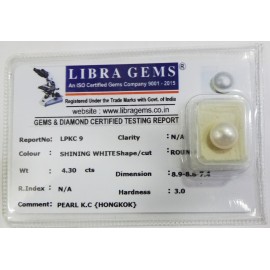 REPORT.NO.-LPKC 9CLARITY.-N/ACOLOUR.-SHINING WHITESHAPE/CUT.-ROUNDWT.-4.30 CTSDIMENSION.-8-9.8-8.7-4.R.INDEX.-N/AHARDNESS.-3.0COMMENT.-PEARL K.C { HONGKOK }..