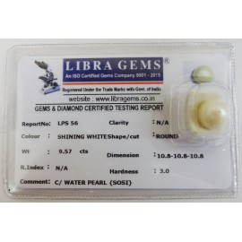 REPORT NO . LPS 56CLARITY . N/ACOLOUR . SHINING WHITESHAPE / CUT . ROUNDWT . 9.57 CTSDIMENSION . 10-8.10-8.10-8.R . INDEX . N/AHARDNESS .3.0COMMENT . C / WATER PEARL { SOSI }..