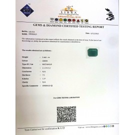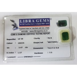 REPORT NO . LE 58CLARITY . N/ACOLOUR . GREENSHAPE / CUT . RECTANGLEWT . 3.47 CTSDIMENSION . 9-2.7-1.5-6.R . INDEX . 1.57HARDNESS . 7.5COMMENT . EMERALD..