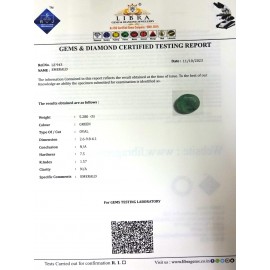 DATE:11-10-2023REF.NO:LE 943NAME:EMERALDWEIGHT:5.28 CTSCOLOUR:GREENTYPE OF/CUT:OVALDIMENSION:2-6.9-8.6-1.CONCLUSION:N/AHARDNESS:7.5R.INDEX:1.57CLARITY:N/ASPECIFIC COMMENTS:EMERALD..