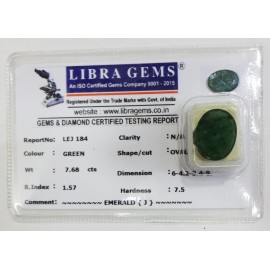 REPORT.NO.-LEJ 184CLARITY.-N/ACOLOUR.-GREENSHAPE/CUT.-OVALWT.-7.68 CTSDIMENSION.-6-4.2-9.4-9.R.INDEX.-1.57HARDNESS.-7.5COMMENT.-EMERALD { J }..