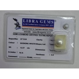 REPORT NO . LP 524CLARITY . N/ACOLOUR . SHINING WHITESHAPE / CUT . ROUNDWT . 6.37 CTSDIMENSION . 9-8.9-8.7-8.R . INDEX . N/AHARDNESS . 3.0COMMENT . PEARL..