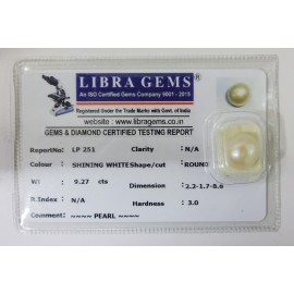 REPORT NO . LP 251CLARITY . N/ACOLOUR . SHINING WHITESHAPE / CUT . ROUNDWT . 9.27 CTSDIMENSION . 2-2.1-7.8-8.R . INDEX . N/AHARDNESS . 3.0COMMENT . PEARL..