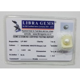 REPORT NO . LP 697CLARITY . N/ACOLOUR . SHINING WHITESHAPE / CUT . ROUNDWT . 3.63 CTSDIMENSION . 8-1.8-1.6-4.R . INDEX . N/AHARDNESS . 3.0COMMENT . PEARL..