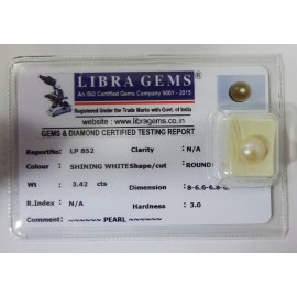REPORT NO . LP 852CLARITY . N/ACOLOUR . SHINING WHITESHAPE / CUT . ROUNDWT . 3.42 CTSDIMENSION . 8-6.6-6.8-6.R . INDEX . N/AHARDNESS . 3.0COMMENT . PEARL..