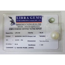 REPORT NO . LPS 99CLARITY . N/ACOLOUR . SHINING WHITESHAPE / CUT . ROUNDWT . 12.91 CTSDIMENSION . 2-1.2-1.2-1.R . INDEX . N/AHARDNESS . 3.0COMMENT . C / WATER PEARL { SOSI }..