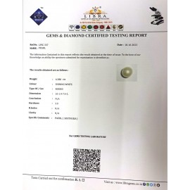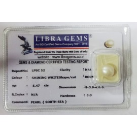 REPORT NO . LPSC 52CLARITY . N/ACOLOUR . SHINING WHITESHAPE / CUT . ROUNDWT . 5.47 CTSDIMENSION . 9-3.8-4.9-9.R . INDEX . N/AHARDNESS . 3.0COMMENT . PEARL { SOUTH SEA }..