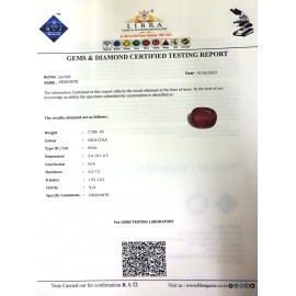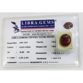 REPORT.NO.LHS 216CLARITY.N/SCOLOUR.COCA COLASHAPE/CUT.OVALWT.8.69 CTSDIMENSION.2.8-1.1-7.7R.INDEX.1.92-2.02HARDNESS.6.5-7.5COMMENT.HESSONITE {S}..