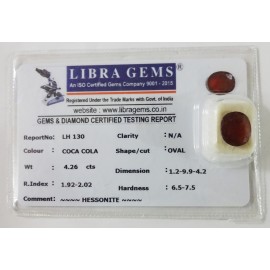 REPORT NO . LH 130CLARITY . N/ACOLOUR . COCA COLASHAPE / CUT . OVALWT . 4.26 CTSDIMENSION . 1-2.9-9.4-2.R . INDEX . 1.92-2.02HARDNESS . 6.5-7.5COMMENT . HESSONITE..