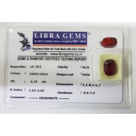 REPORT.NO.-LH 293CLARITY.-N/ACOLOUR.-COCA COLASHAPE/CUT.-OVALWT.-5.75 CTSDIMENSION.-1-1.8-1.6-7.R.INDEX.-1.92-2.02HARDNESS.-6.5-7.5COMMENT.-HESSONITE..