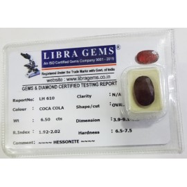 REPORT.NO.-LH 610CLARITY.-N/ACOLOUR.-COCA COLASHAPE/CUT.-OVALWT.-6.50 CTSDIMENSION.-3-9.9-1.5-5.R.INDEX.-1.92-2.02HARDNESS.-6.5-7.5COMMENT.-HESSONITE..