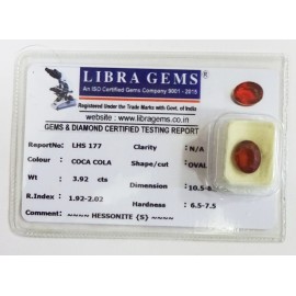 REPORT.NO.-LHS 177CLARITY.-N/ACOLOUR.-COCA COLASHAPE/CUT.-OVALWT.-3.92 CTSDIMENSION.-10-5.8-3.4-9.R.INDEX.-1.92-2.02HARDNESS.-6.5-7.5COMMENT.-HESSONITE { S }..