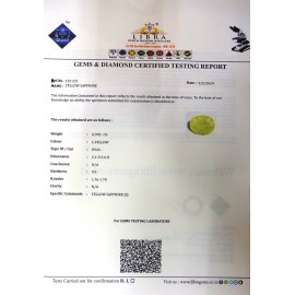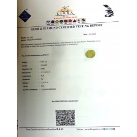 REPORT NO . LY 85CLARITY . N/ACOLOUR . YELLOWSHAPE / CUT . OVALWT . 3.43 CTSDIMENSION . 8-7.7-8.4-8.R . INDEX . 1.76-1.78HARDNESS . 9.0COMMENT . YELLOW SAPPHIRE..