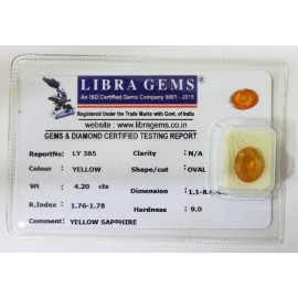 REPORT.NO.LY 385CLARITY.N/ACOLOUR.YELLOWSHAPE/CUT.OVALWT.4.20 CTSDIMENSION.1.1-8.6-4.3R.INDEX.1.76-1.78HARDNESS.9.0COMMENT.YELLOW SAPPHIRE..