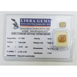 REPORT.NO.LY 590CLARITY.N/ACOLOUR.YELLOWSHAPE/CUT.SQUARE WT.5.47 CTSDIMENSION.9.1-92-5.6R.INDEX.1.76-1.7.8HARDNESS.9.0COMMENT.YELLOW SAPPHIRE..