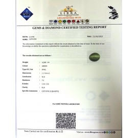DATE:11-10-2023REF.NO:LC 878NAME:CATS EYE WEIGHT:4.20 CTSCOLOUR:GREENTYPE OF/CUT:OVALDIMENSION:1.1-9.6-6.1CONCLUSION:N/AHARDNESS:7.5R.INDEX:1.54-1.55CLARITY:N/ASPECIFIC COMMENTS:CATS EY..