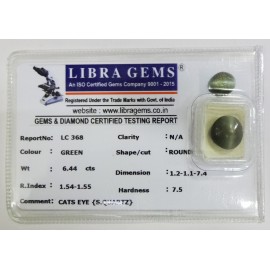 REPORT.NO.-LC 368CLARITY.-N/ACOLOUR.-GREENSHAPE/CUT.-ROUNDWT.-6.44 CTSDIMENSION.-1-2.1-1.7-4.R.INDEX.-1.54-1.55HARDNESS.-7.5COMMENT.-CATS EYE { S . QUARTZ }..