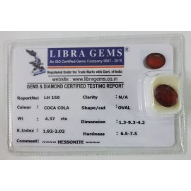 REPORT NO . LH 159CLARITY . N/ACOLOUR . COCA COLASHAPE / CUT . OVALWT . 4.37 CTSDIMENSION . 1-3.9-3.4-2.R . INDEX . 1.92-2.02HARDNESS . 6.5-7.5COMMENT . HESSONITE..