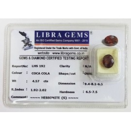 REPORT.NO.-LHS 192CLARITY.-N/ACOLOUR.-COCA COLASHAPE/CUT.-OVALWT.-4.57 CTSDIMENSION.-9-4.8-1.6-5.R.INDEX.-1.92-2.02HARDNESS.-6.5-7.5COMMENT.-HESSONITE { S }..