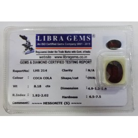 REPORT.NO.LHS 214CLARITY.N/ACOLOUR.COCA COLASHAPE/CUT.OVALWT.8.18 CTSDIMENSION.4.9-1.2-5.8R.INDEX.1.92-2.02HARDNESS.6.5--7.5COMMENT.HESSONITE {S}..