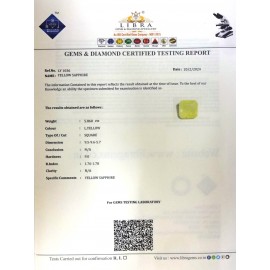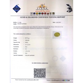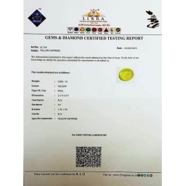 REPORT NO . LYA 28CLARITY . N/ACOLOUR . YELLOWSHAPE / CUT . OVALWT . 6.55 CTSDIMENSION . 3-1.10-3.4-8.R . INDEX . 1.76-1.78HARDNESS . 9.0COMMENT . YELLOW SAPPHIRE..