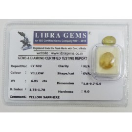 REPORT.NO.LY 602CLARITY.N/ACOLOUR.YELLOWSHAPE/CUT.OVALWT.6.85 CTSDIMENSION.1.8-9.7-5.6R.INDEX.1.76-1.7.8HARDNESS.9.0COMMENT.YELLOW SAPPHIRE..