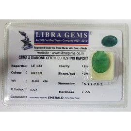 REPORT NO . LE 133CLARITY . N/ACOLOUR . GREENSHAPE / CUT . OVALWT . 8.04 CTSDIMENSION . 5-1.1-7.6-2.R . INDEX . 1.57HARDNESS . 7.5COMMENT . EMERALD..