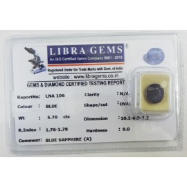 REPORT.NO.LNA 106CLARITY.N/ACOLOUR.BLUESHAPE/CUT.OVALWT.5.70 CTSDIMENSION.10.1-8.9-7.2R.INDEX.1.76-1.78HARDNESS.9.0COMMENT.BLUE SAPPHIRE {A}..
