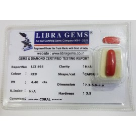 REPORT.NO.LCI 495CLARITY.N/ACOLOUR.REDSHAPE/CUT.CAPSULEWT.4.40 CTSDIMENSION.7.3-5.9-4.8R.INDEX.N/AHARDNESS.3.5COMMENT.CORAL..