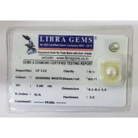 REPORT NO . LP 123CLARITY . N/ACOLOUR . SHINING WHITESHAPE / CUT . ROUNDWT . 3.00 CTSDIMENSION . 8-1.8-1.5-9.R . INDEX . N/AHARDNESS . 3.0COMMENT . PEARL..