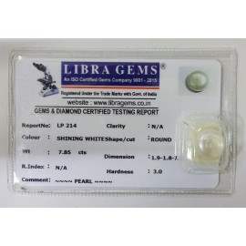 REPORT NO . LP 214CLARITY . N/ACOLOUR . SHINING WHITESHAPE / CUT . ROUNDWT . 7.85 CTSDIMENSION . 1-9.1-8.7-1.R . INDEX . N/AHARDNESS . 3.0COMMENT . PEARL..