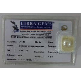 REPORT NO . LP 580CLARITY . N/ACOLOUR . SHINING WHITESHAPE / CUT . ROUNDWT . 5.46 CTSDIMENSION . 10-3.10-3.6-5.R . INDEX . N/AHARDNESS . 3.0COMMENT . PEARL..