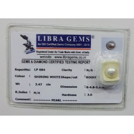 REPORT NO . LP 684CLARITY . N/ACOLOUR . SHINING WHITESHAPE / CUT . ROUNDWT . 3.47 CTSDIMENSION . 8-4.8-5.5-9.R . INDEX . N/AHARDNESS . 3.0COMMENT . PEARL..