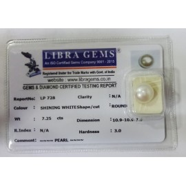 REPORT NO . LP 728CLARITY . N/ACOLOUR . SHINING WHITESHAPE / CUT . ROUNDWT . 7.25 CTSDIMENSION . 10-9.10-9.7-9.R . INDEX . N/AHARDNESS . 3.0COMMENT . PEARL..