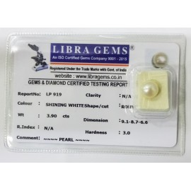 REPORT NO . LP 919CLARITY . N/ACOLOUR . SHINING WHITESHAPE / CUT . ROUNDWT . 3.90 CTSDIMENSION . 8-7.8-7.6-6.R . INDEX . N/AHARDNESS . 3.0COMMENT . PEARL..