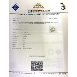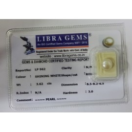 REPORT NO. LP 962CLARITY. N/ACOLOUR. SHINING WHITESHAPE/CUT. ROUNDWT. 3.62 CTSDIMENSION. 8.5-8.2-6.5R.INDEX. N/AHARDNESS. 3.0COMMENT. PEARL..