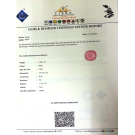 REPORT.NO.-LR 389CLARITY.-N/ACOLOUR.-PINKSHAPE/CUT.-OVALWT.-6.74 CTSDIMENSION.-1-5.9-5.5-4.R.INDEX.-1.76-1.78HARDNESS.-9.0COMMENT.-RUBY..